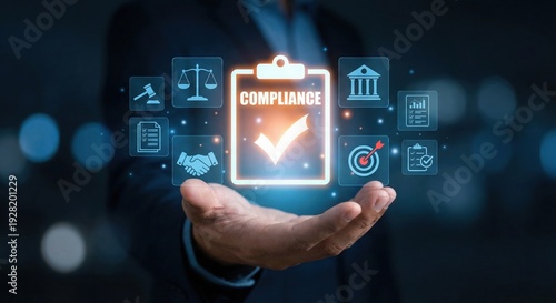 Man holding a glowing clipboard with a checkmark and the word 'COMPLIANCE', surrounded by icons representing legal and business standards.