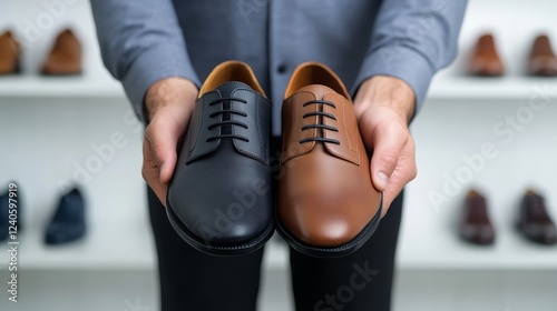 Man holding a pair of formal shoes in one hand and casual sneakers in the other modern shoe store with sleek display shelves