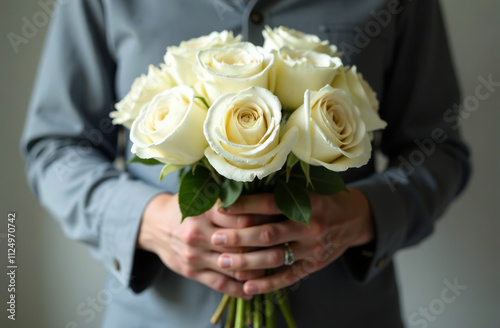 Man holding bouquet of white roses, gift flavor of large flowers. AI Generative