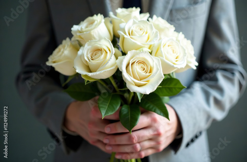 Man holding bouquet of white roses, gift flavor of large flowers. AI Generative
