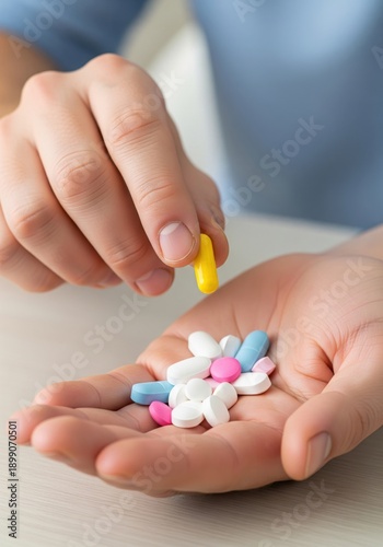 Man holding single yellow capsule for daily dosing and home medical treatment routine