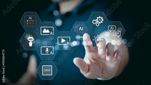 Man holding virtual interface of AI agents and smart assistant. Future technology concept of artificial intelligence helping business with generative tools, chat bots, and digital automation.