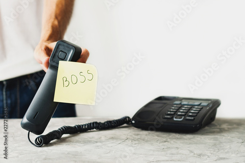 Man holds handset with paper with handwritten inscription boss near concrete table with old telephone on white background. Communication concept. Copy space