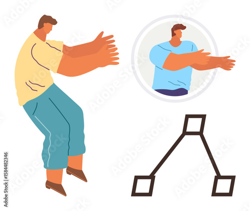 Man in casual attire stretches arms, reflecting movement in a circular mirror. Black flowchart diagram symbolizes connections. Ideal for teamwork, leadership, unity, organization, reflection
