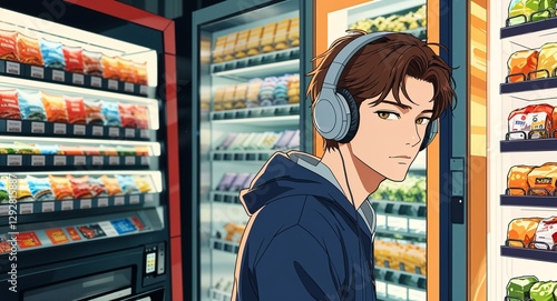 Man in headphones leaning against vending machine background anime cartoon illustration