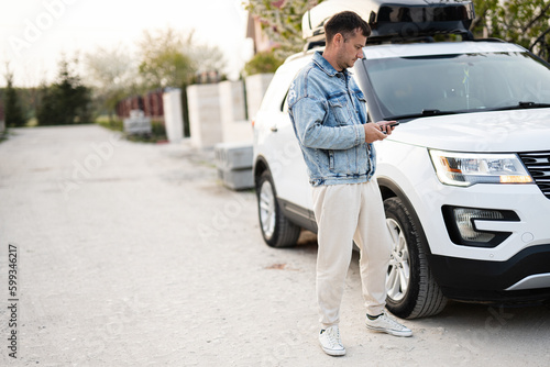 Man in jeans jacket with phone in hand standing near white american suv car with roof rack box.