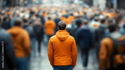 Man in Orange Jacket Standing Still Amidst Blurred Crowd, AI