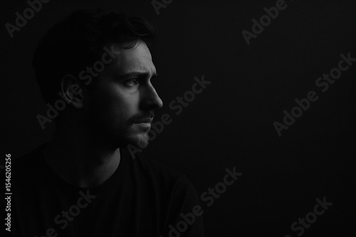 Man in profile looking pensively into darkness, black and white portrait