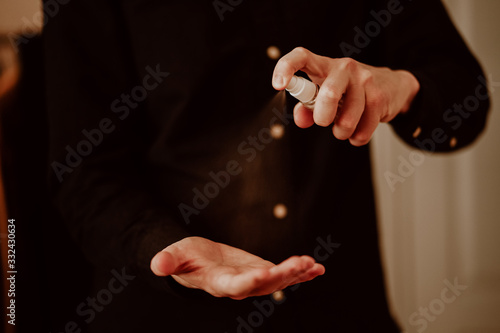 Man in protective mask and with antibacterial antiseptic gel for hands disinfection and health protection prevention during flu virus outbreak, epidemic and infectious diseases