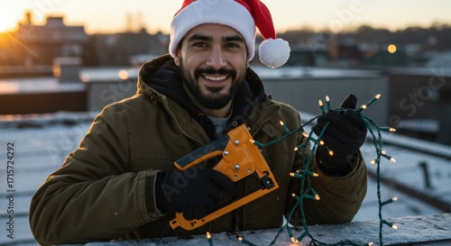 Man in santa hat preparing Christmas decoration lights. Rooftop holiday cheer for Winter season. Residential outdoor festive lighting concept.