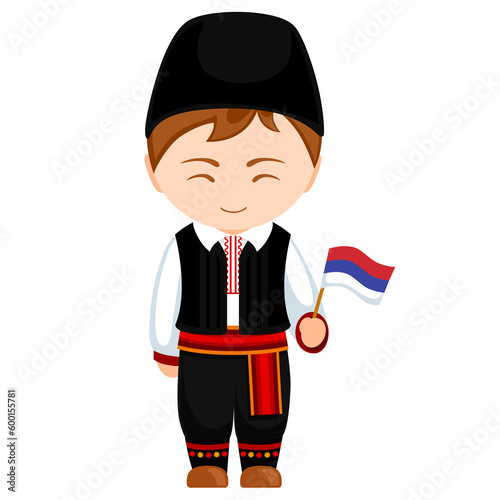 Man in Serbia national costume. Male cartoon character in traditional serbian ethnic clothes holding flag. Flat isolated illustration.