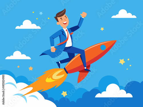 Man in suit riding a rocket through the sky with clouds and stars in the background illustration