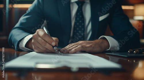 Man in suit signing document at desk