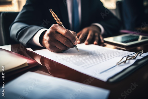 Man in suit writing on piece of paper. This image can be used for business, education, or office-related themes.