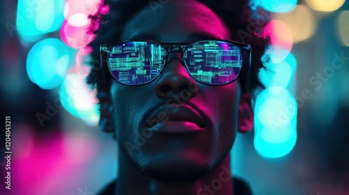 Man in Sunglasses with Neon Reflections in Urban Environment