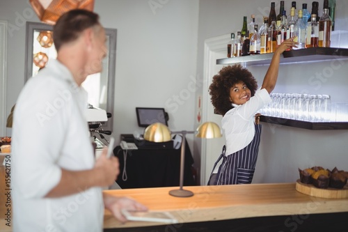 Man interacting with waitress at counter