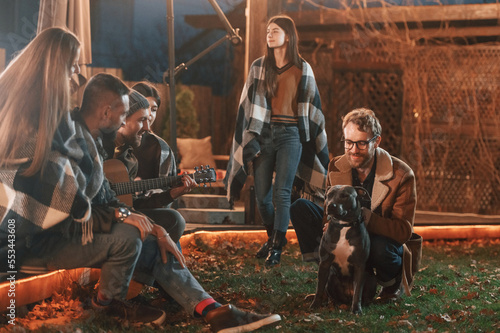Man is petting his dog. Group of people is spending time together on the backyard at evening time