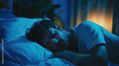 Man is sleeping on a bed with a blue pillow. The room is dimly lit, and the man's face is resting on the pillow