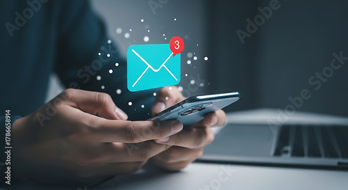 Man is using smartphone with notification of received emails showing three new unread messages, symbolizing digital communication and inbox management.