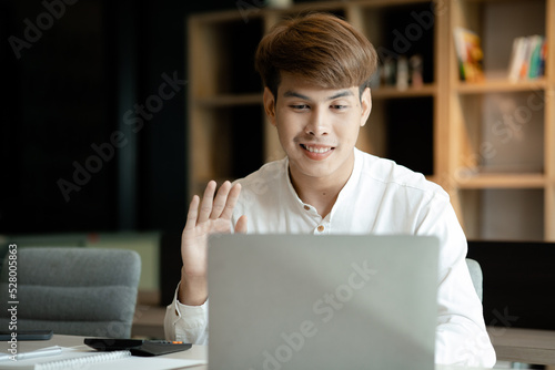 Man is video call with coworker through laptop, he working in marketing department planning meeting with coworkers, marketing plan for company to grow. Concept of working in a startup company office.