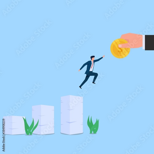 Man jump between papers stack to reach coin metaphor of target and effort. Business flat vector concept illustration.