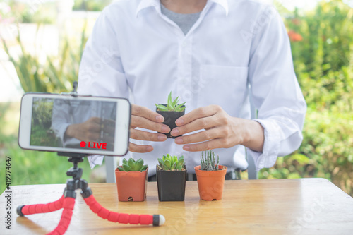 Man live streaming on smartphone internet to training plant cactus at home