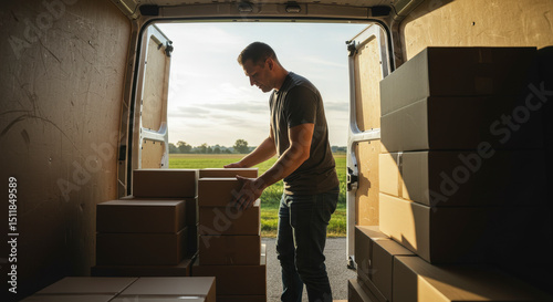 Man Loading Cardboard Boxes into Delivery Truck in Rural Setting