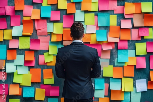 Man Looking at Wall of Sticky Notes: Planning and Brainstorming in the Workplace