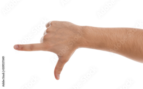 Man making frame with his hand on white background, closeup