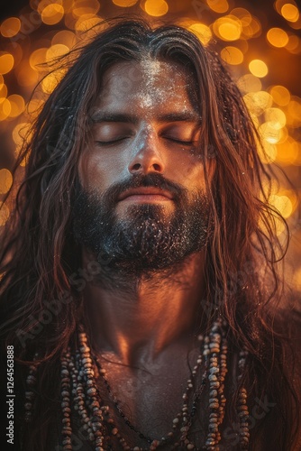 Man meditating with long hair and beads in a serene environment with warm bokeh lights, embodying peace and tranquility in wellness and spirituality.