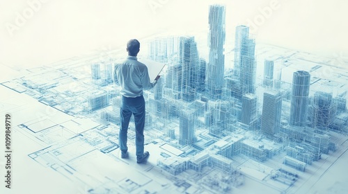 Man Observing Digital Blueprint of Futuristic City, Abstract Architectural Concept, Urban Planning Scene