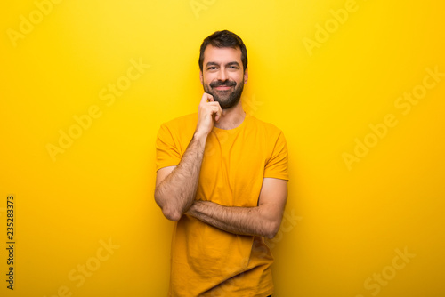 Man on isolated vibrant yellow color smiling with a sweet expression