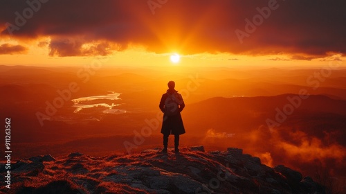 Man on Mountaintop at Sunrise, Looking at Horizon