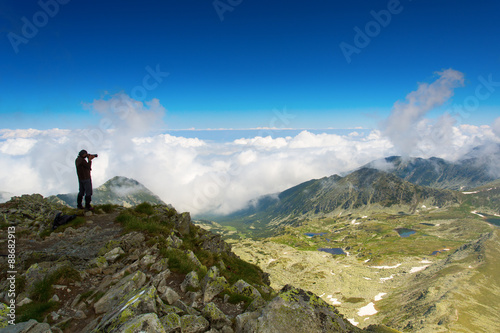 Man photographing a mountain lake