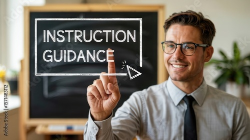 Man pointing at instruction guidance text on blackboard
