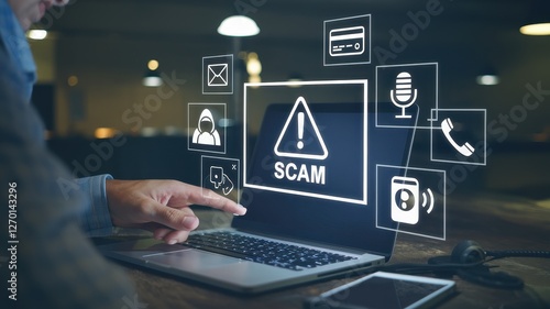 Man points at a scam warning on a laptop screen