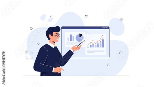 Man presenting data charts and graphs on a digital screen, business presentation