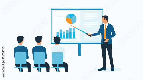 Man presenting data on a whiteboard to an audience sitting on chairs in a business meeting room scene