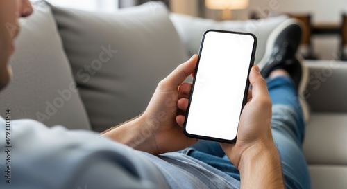 Man relaxing on a sofa, holding a smartphone with a blank white screen, wearing jeans and sneakers.