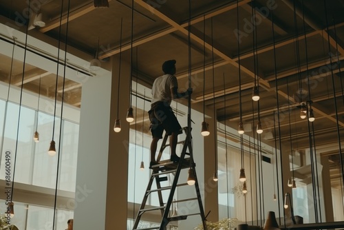Man repair light lamp chandelier lighting cafe restaurant establishment inside design interior worker eatery modern style comfortable decor equipment illuminated service cosy hotel luxury architecture