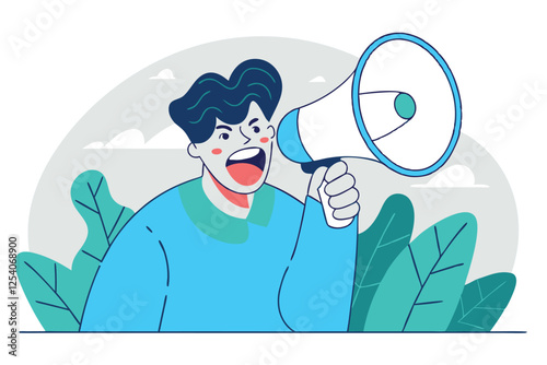 Man screaming on a megaphone. Promotion, advertisement, commercial. Vector illustration