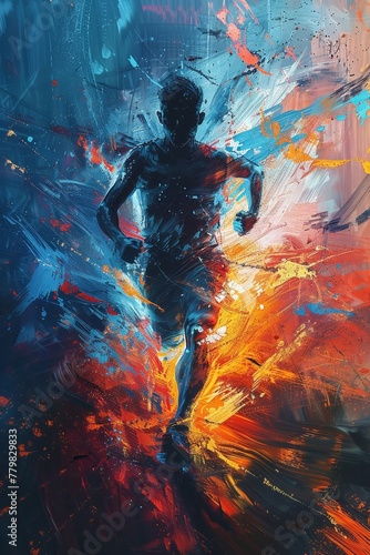 Man seen from behind running with a blurred motion effect, resembling a digital art style painting illustration.