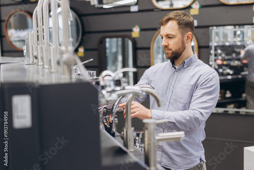 Man selecting modern faucet for home renovation, exploring plumbing fixtures in a hardware store showroom