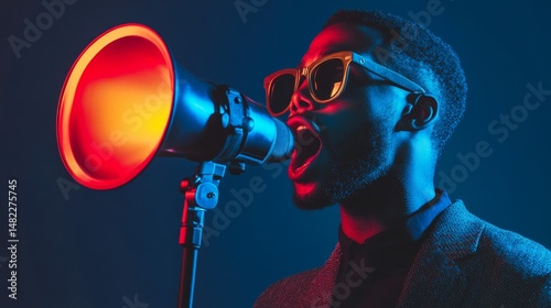 Man shouting through megaphone with red blue lighting in modern expression campaign activist scene
