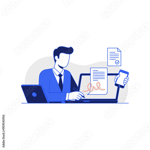 Man signing digital document on laptop with smartphone.