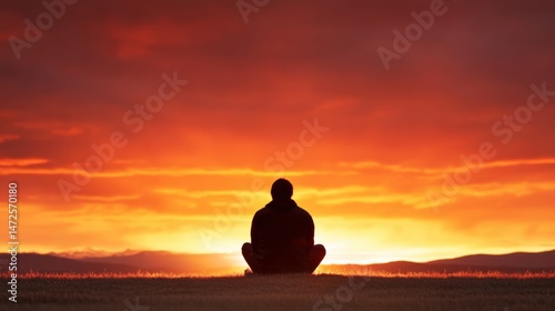 Man sits meditating at sunset