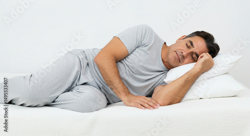 Man sleeping on his side in bed with a white pillow