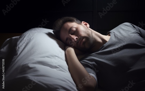 Man sleeps on bed in his bedroom feeling so relax and comfortable.