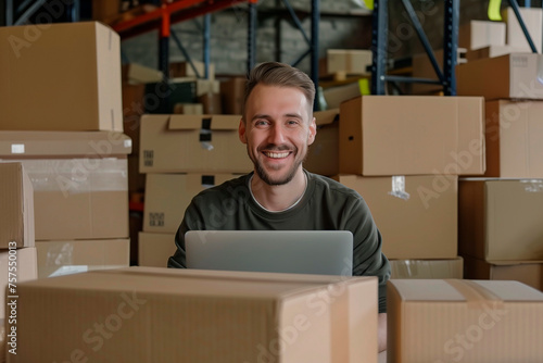 man smiling at his laptop sits at desk looking in boxes
