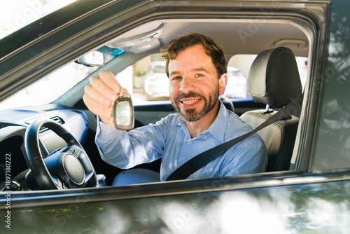 Man smiling inside a car, proudly holding up car keys. Representing ownership, renting, and driving concepts